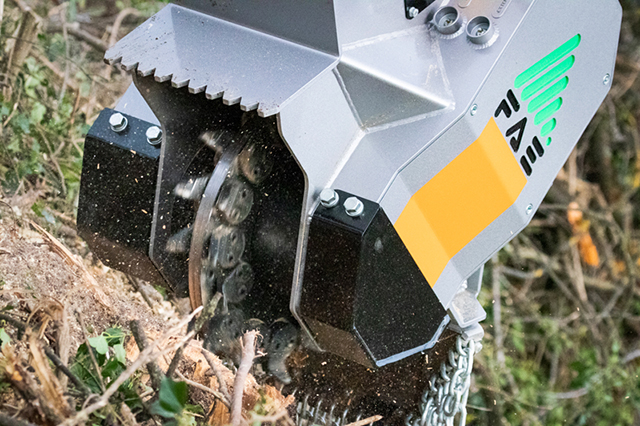 The SCL/HY is a new compact stump cutter for removing individual stumps in forests, parks, roadside and on river banks. Its smaller size makes it very easy to maneuver and suitable for small and midsize excavators (4 to 7.5 t). The piston engine (with manually controlled variable displacement) makes it easy to use on different excavators with different oil flow rates.